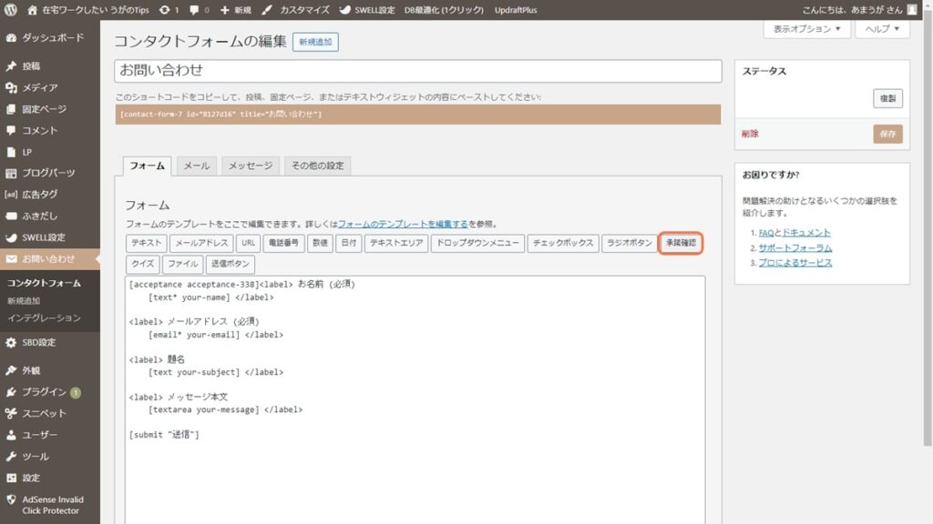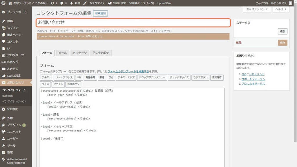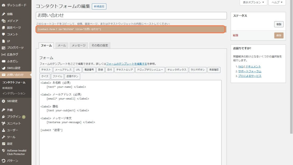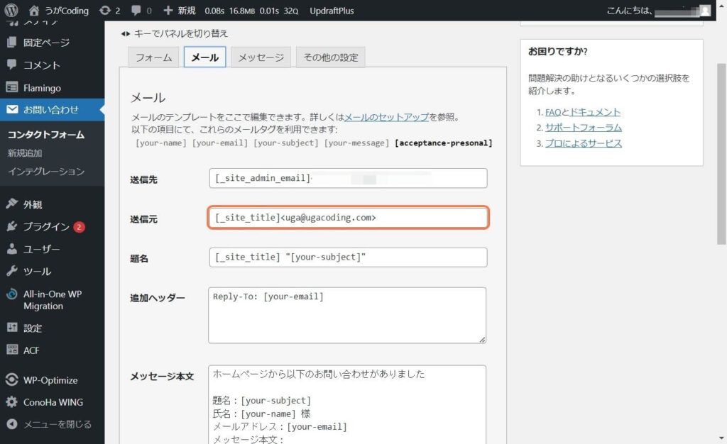 コンタクトフォームでの設定と自動出力のタグを確認する。