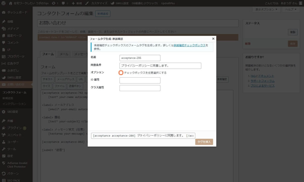 同意条件を記入して、オプションの「チェックボックスを任意選択にする」を外す。