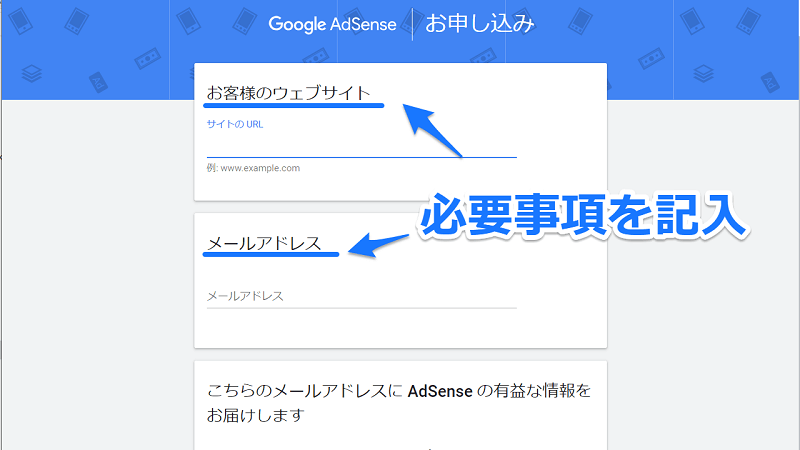 アドセンスのサイトにさえ行けば、あとは手順に沿って記入していくだけ。