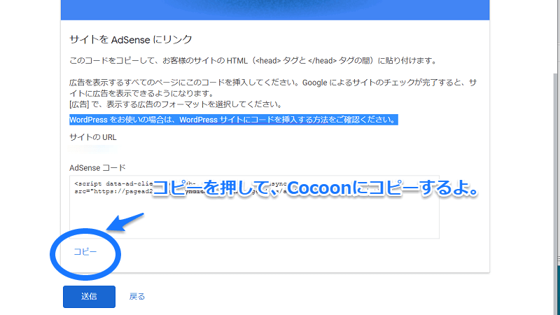 審査用のAdSenseコードを「コピー」をしてcocoonに移植するよ。