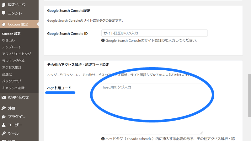 「ダッシュボード→Cocoon設定→アクセス解析・認証」タブにある「ヘッド用コード」の欄に貼るんだって。