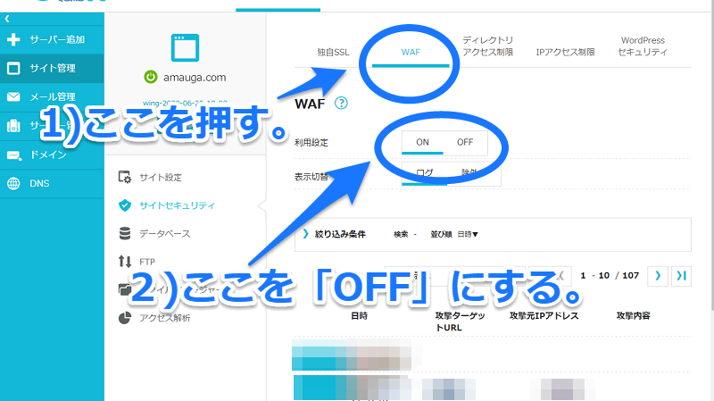 この表示がでてきたら、サーバーで「WAF」を一度解除しないといけないのよ。