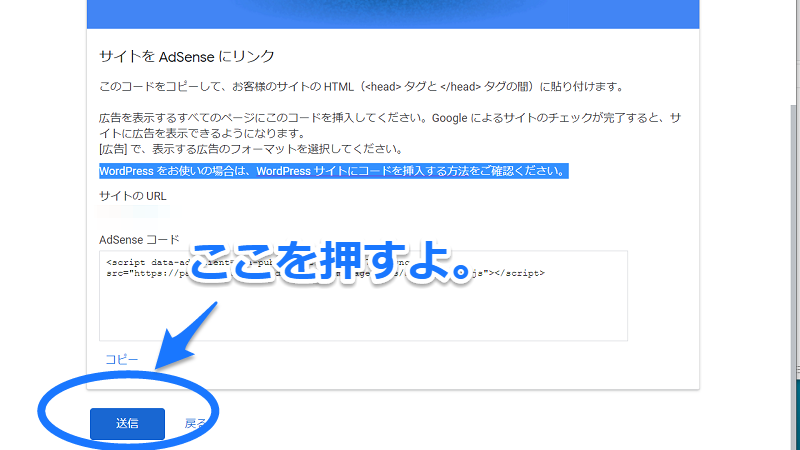 そしたら、今度はアドセンスの画面に戻って、「送信」を押してね。