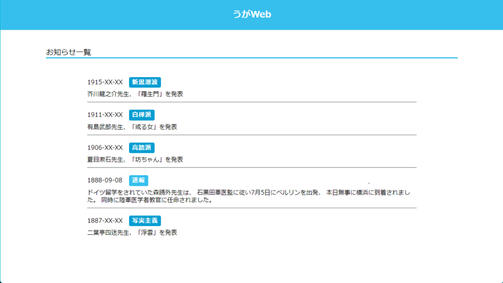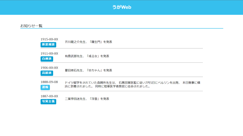 お知らせ一覧 仕様 ハードリセット 利用 2段で、左段は日付とラベル、右段はタイ...