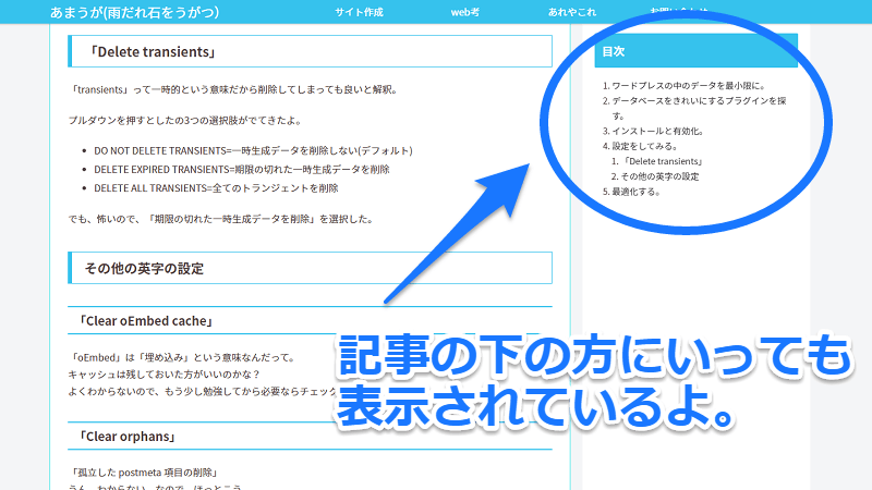 設定するときは「サイドバー」に目次を設定するんじゃなくて、「サイドバースクロール追従」に設定すると、記事の最後の方まで進んでも目次を確認することができるよ。