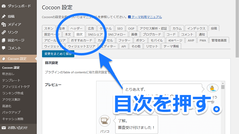 見出しをきれいに直せたら、いよいよ目次を表示するよ。