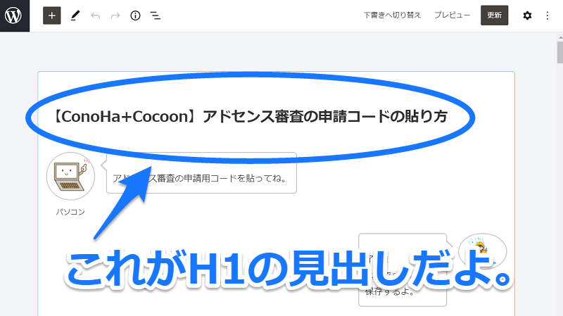 一番上の書き込んだ文章は「H1」の見出しと認識されているよ。