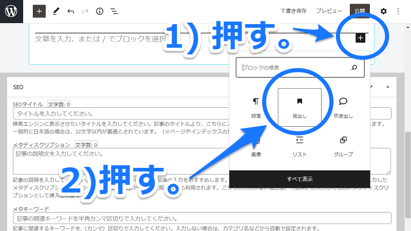 ブロックエディタで追加のボタンを押して設定していくよ。
